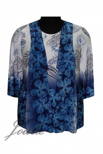 Трикотажная блузка прямого силуэта. Отлетная часть полочки из шифона. Рукав 3/4.