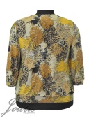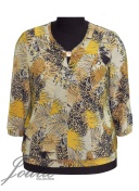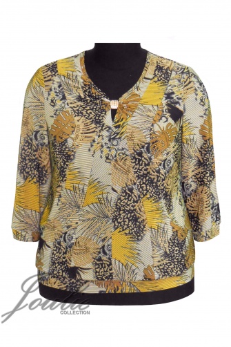 Блузка из тонкого трикотажа прямого силуэта на поясе. Рукав 3/4 на манжете. На полочке небольшая драпировка, закрепленная декоративным элементом.