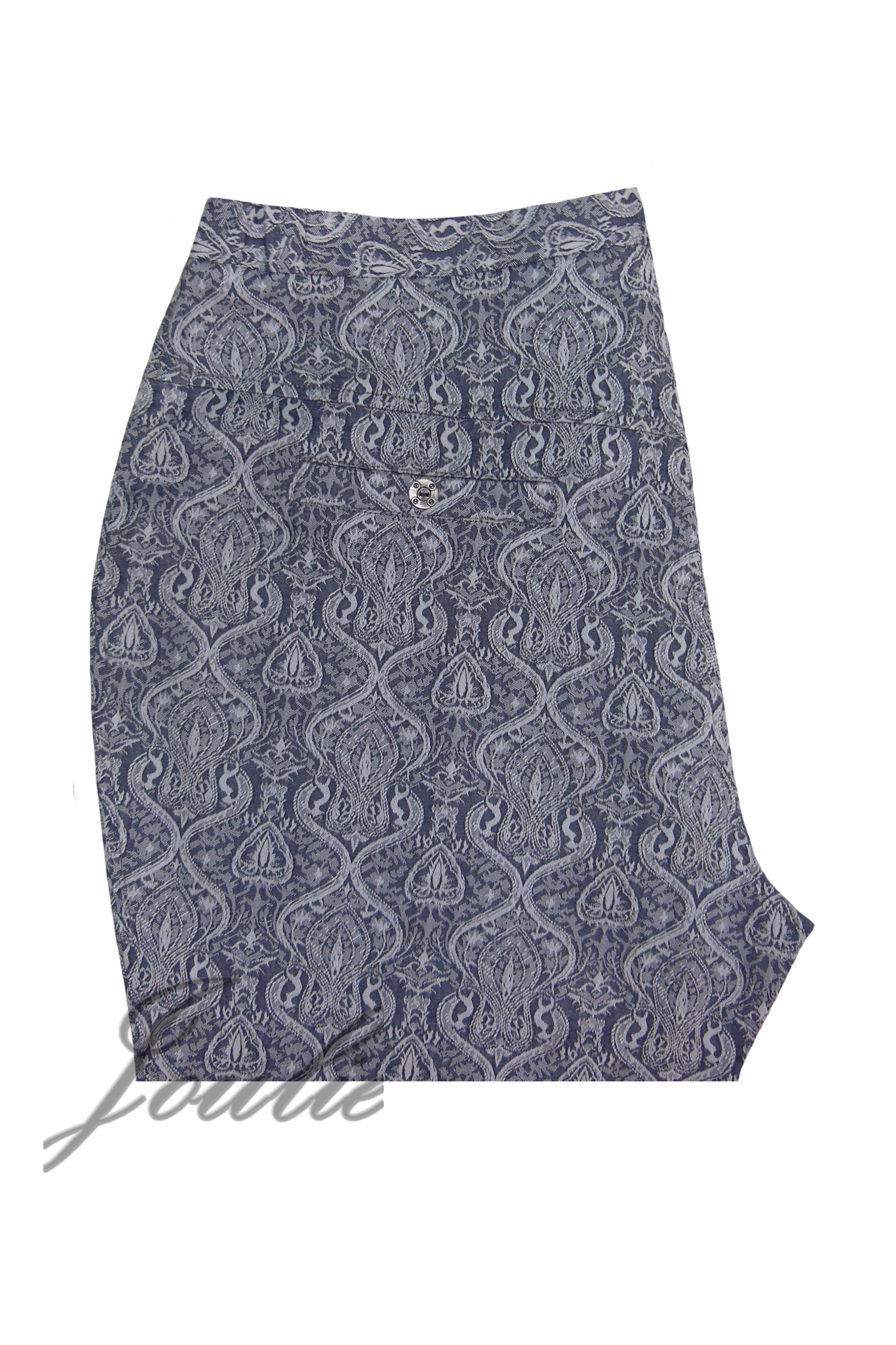 Брюки прилегающего силуэта, зауженные книзу, длиной 7/8. На передних и задних частях брюк обработаны декоративные карманы. В поясе - резинка по бокам.