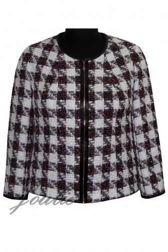 Жакет полуприлегающего силуэта из ткани. Рукав длинный. Застежка на молнию. Вырез горловины округлой формы.