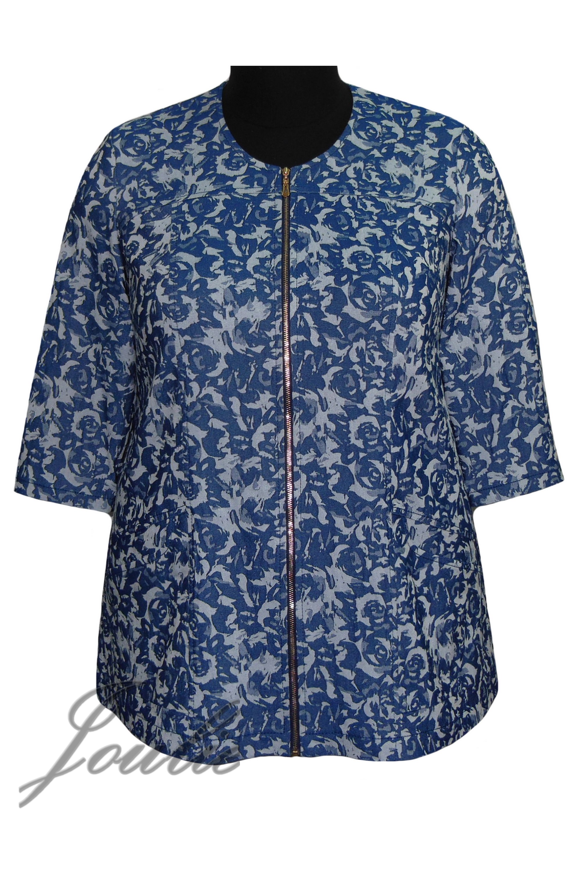 Жакет трапециевидного силуэта из ткани. Застежка на молнию. На полочке функциональные карманы. Рукав 3/4.