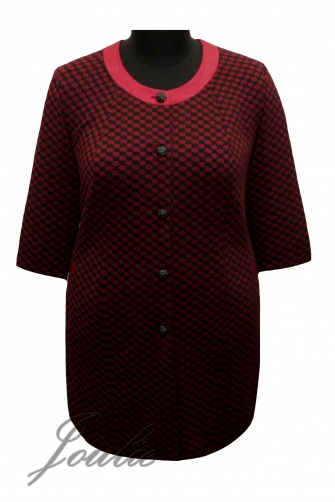 Жакет прямого силуэта из ткани. Рукав 3/4. Вырез горловины круглый. На полочке карманы. Застежка на пуговицы.