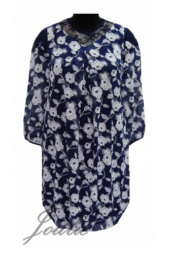 Платье полуприлегающего силуэта из шифона с подкладом из трикотажа. Кокетка полочки и спинки, манжета и вставка рукава из кружева. На спинке застежка на пуговицу. Рукав длинный.