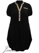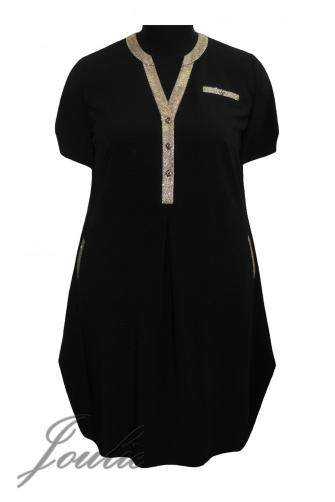 Платье свободного силуэта из ткани. На полочке планка с застежкой на пуговицы. Рукав короткий.