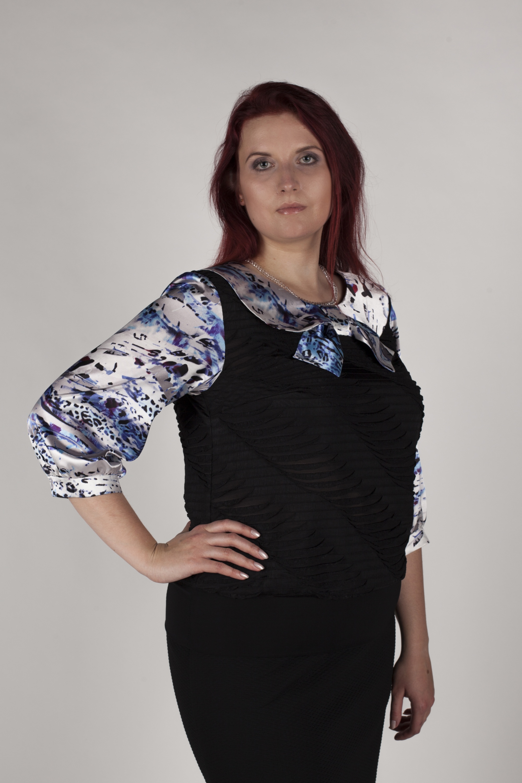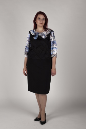 Нарядная блузка из трикотажа свободного силуэта, низ изделия оформлен манжетой. Воротник и рукава из атласа. Отделка из атласа. Рукав 3/4.