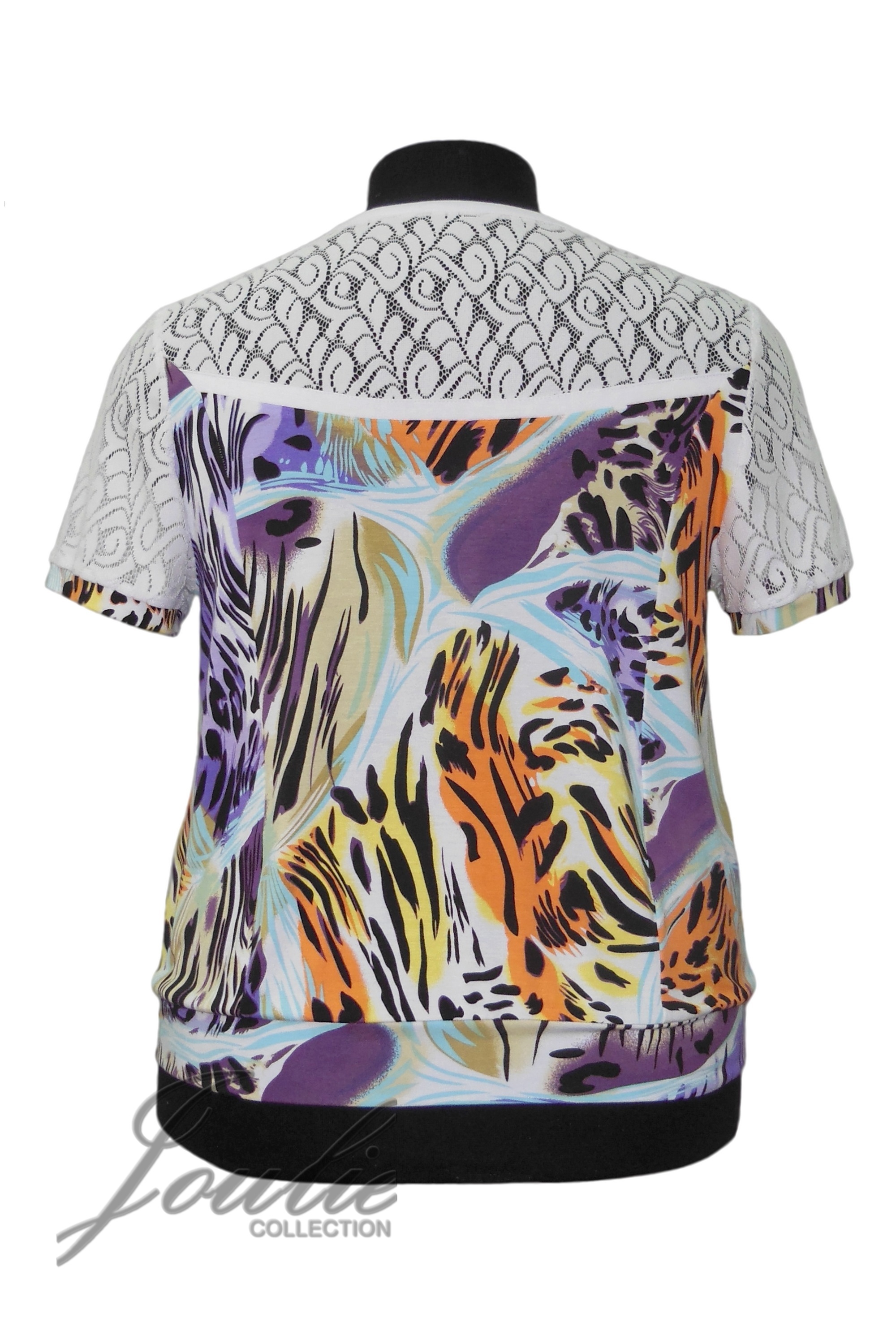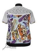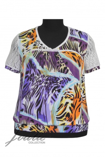 Блуза свободного покроя из трикотажа. Рукав короткий на манжете. По низу блузы пояс. Кокетка и рукава из кружева.