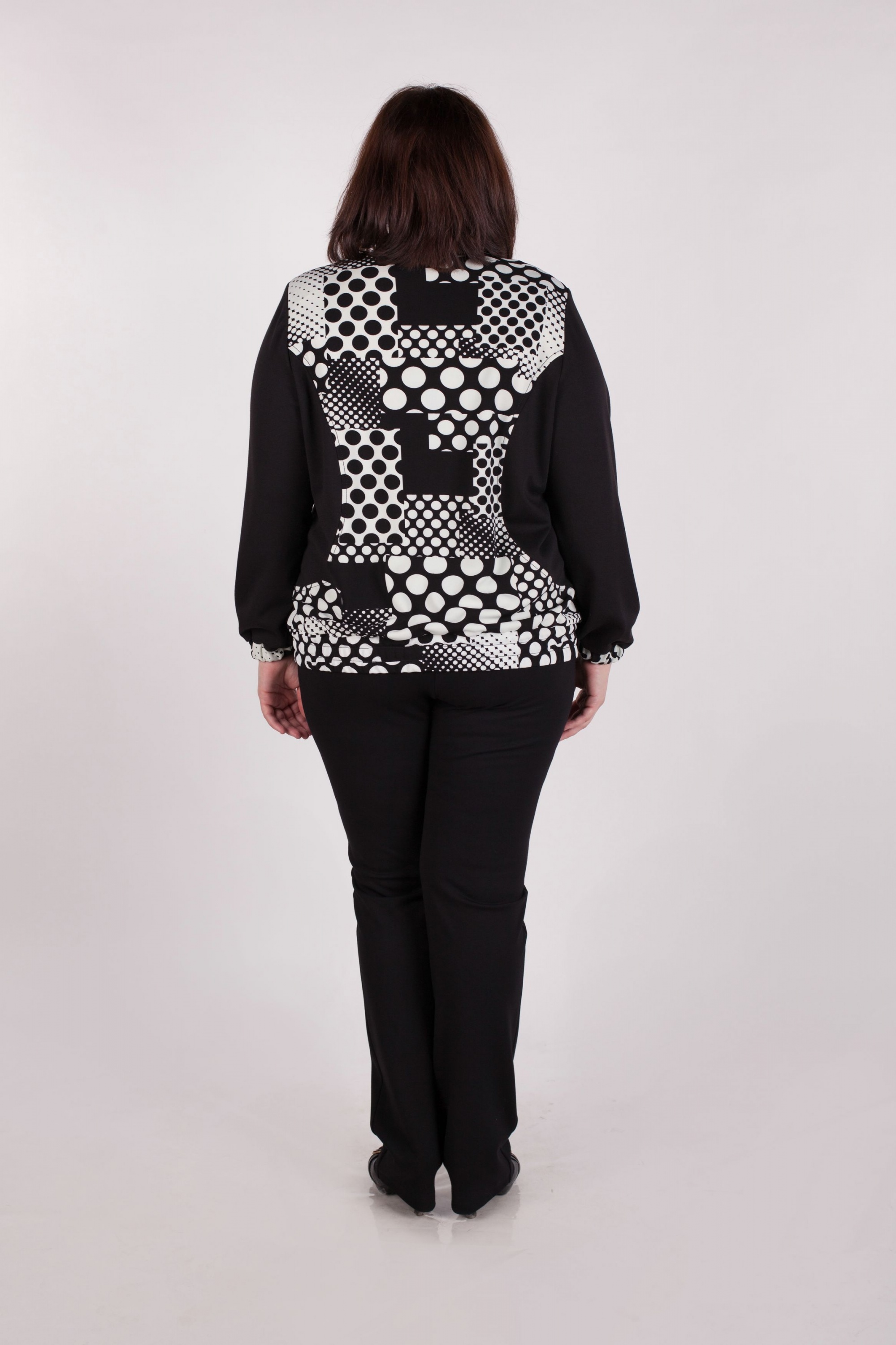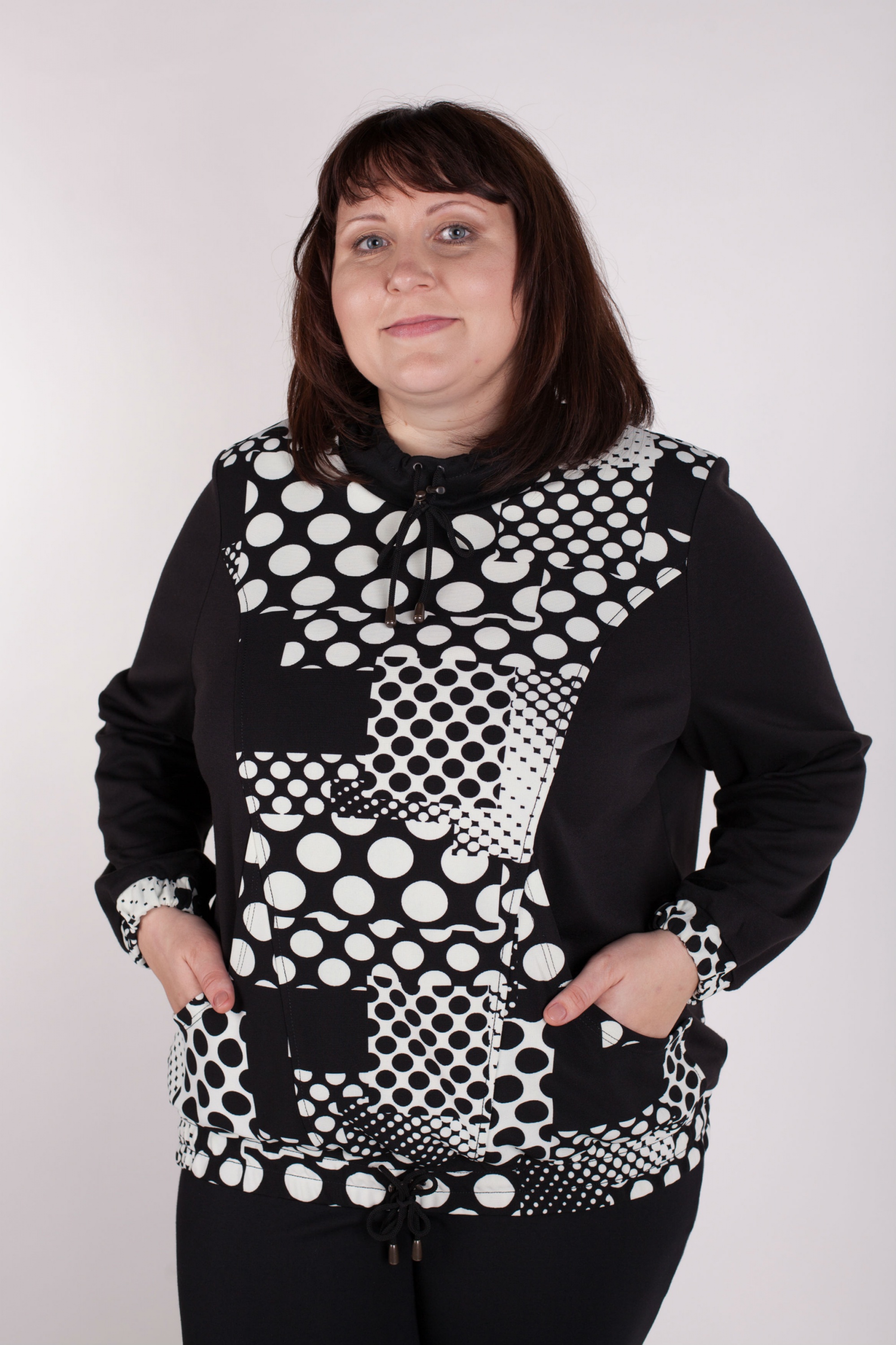 Свободная блузка спортивного покроя с длинными рукавами. Горловина и низ блузки регулируются шнуром с фиксаторами.