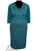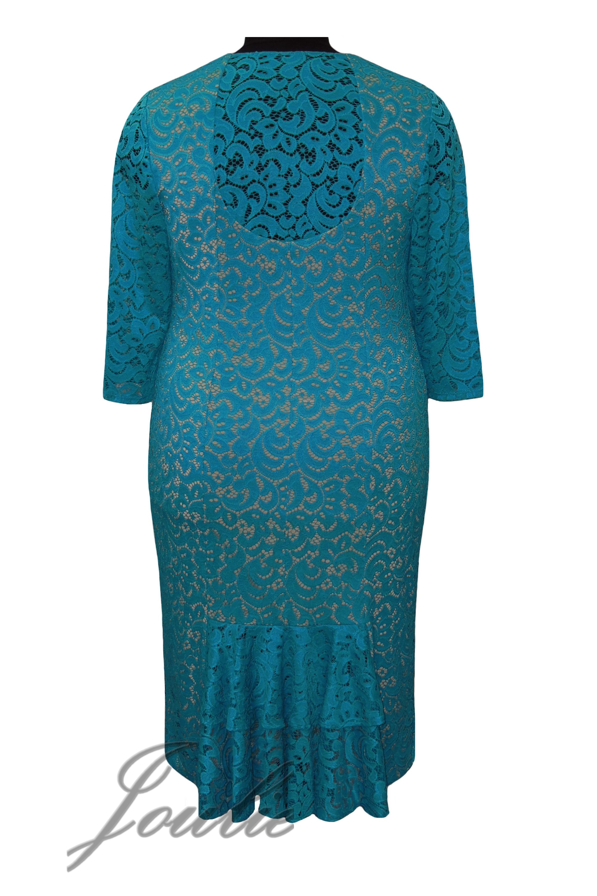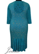 Нарядное платье полуприлегающего силуэта из трикотажа и гипюра. Рукава, вставка по центру спинки и воланы на спинке выполнены из гипюра. Вырез горловины V-образный.