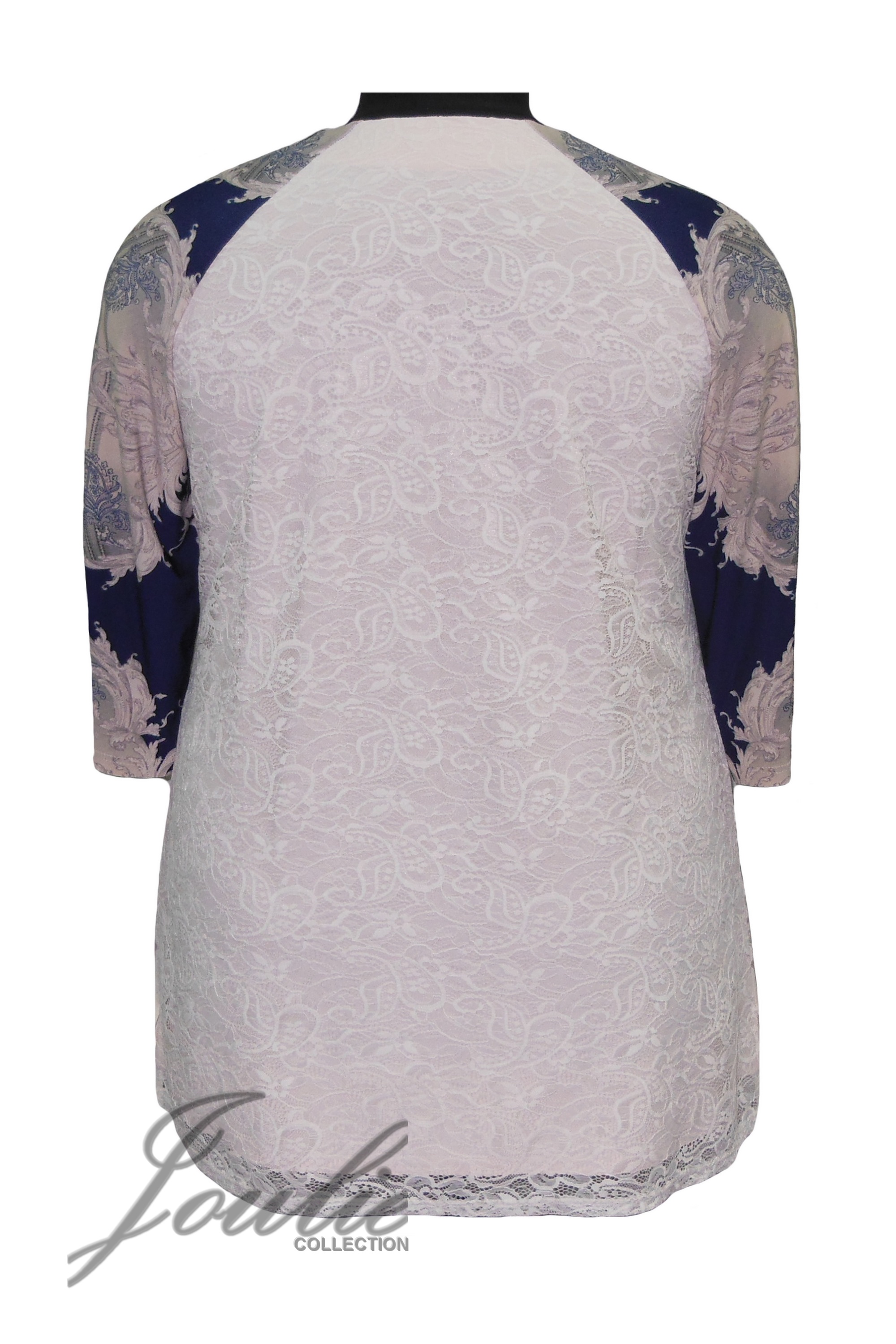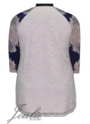 Блуза-туника трапециевидного силуэта из трикотажа покроя реглан. Спинка двойная (трикотаж + гипюр). На бочках полочки функциональные карманы. Вырез горловины украшен бусинами. Рукав 3/4.