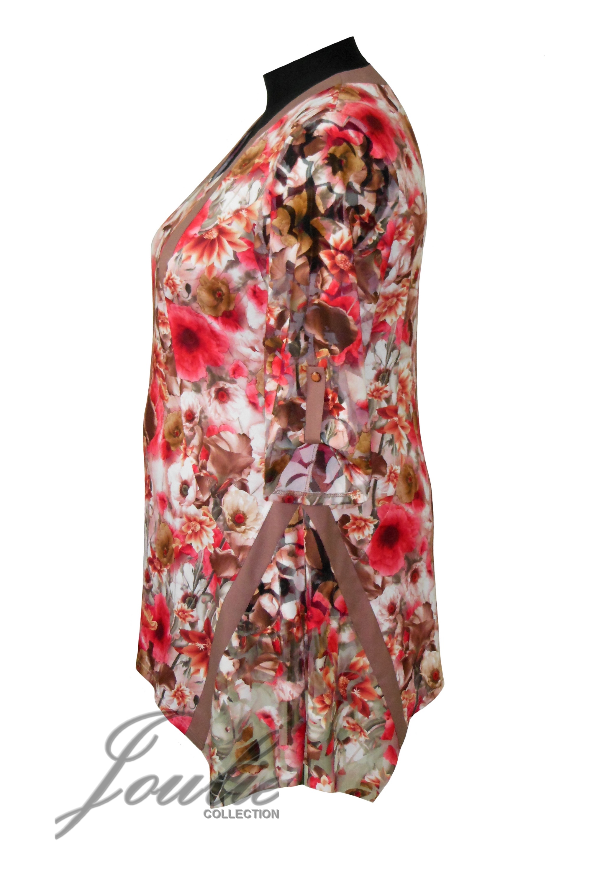 Туника полуприлегающего силуэта, расклешенная к низу. Низ изделия ассиметричный с боковыми клиньями из сетки. Рукав 3/4 из сетки.