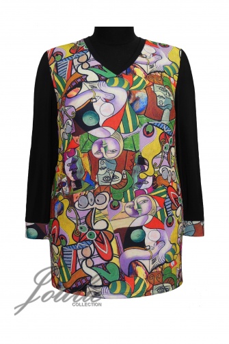 Туника полуприлегающего силуэта из трикотажа. Рукав длинный, на манжете. Низ изделия асимметричный. Спинка из однотонного черного трикотажа. |