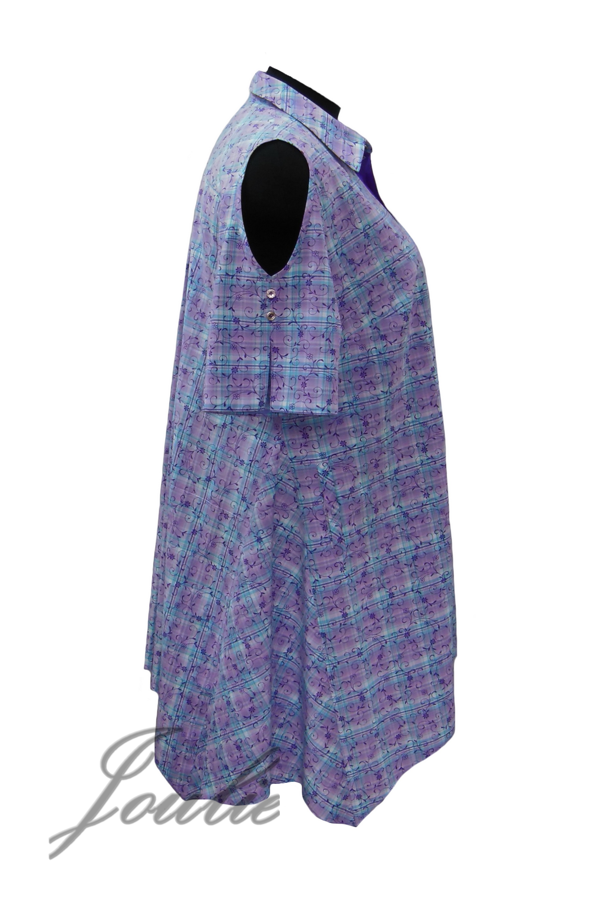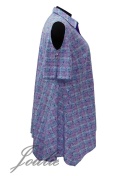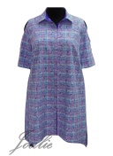 Туника-рубашка свободного силуэта с фигурным низом из ткани. На полочке карманы с листочкой . Рукав короткий с фигурным вырезом. Застежка на пуговицы. Длина по центру спинки 95 см.